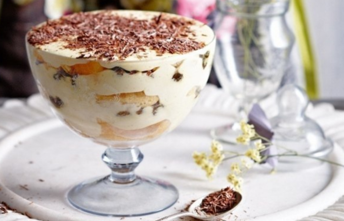 Tada, pakaitomis sluoksniais dėliodami sausainius ir grietinėlę, suformuokite desertą (aš naudojau stiklinį dubenį). Per sietelį pabarstykite kakavos milteliais. Palaikykite šaldytuve per naktį.