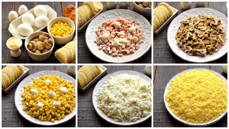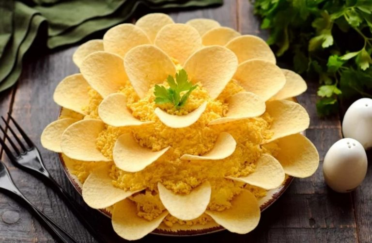 Kaip išvaizda, šios salotos ir tiksliai panašios į chrizantemą – ryškias, gražias ir labai skanias salotas, kurios tikrai patiks jūsų svečiams. Svarbiausia yra pirkti aukštos kokybės bulvių traškučius, iš kurių gaminsime gėlių žiedlapius.