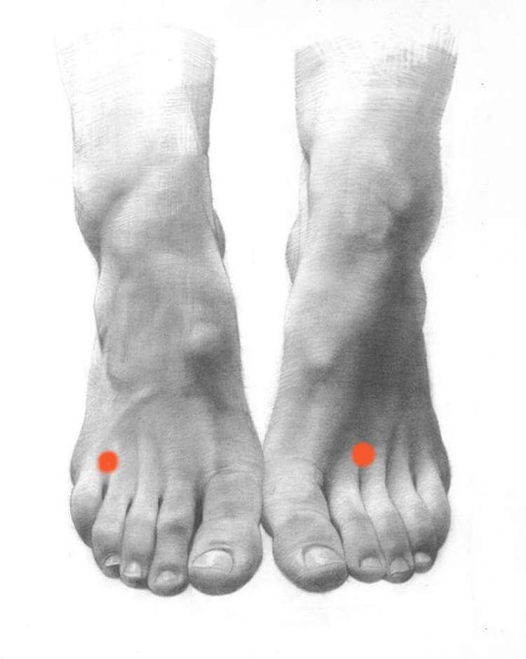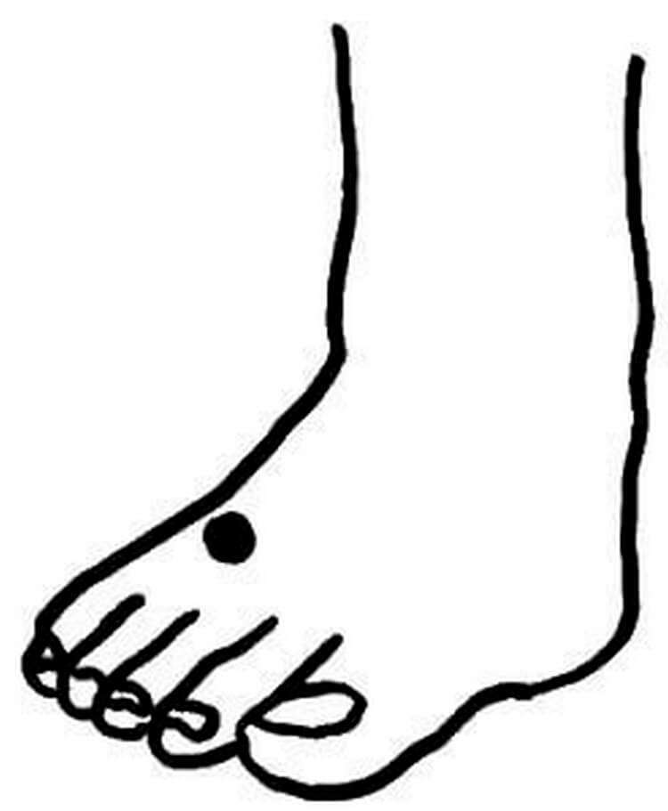 Zulinqi taškas (2 pav.) yra įdubime pėdos šoninės pusės viduryje, už tarpo tarp ketvirtojo ir penktojo metatarsalinių kaulų.