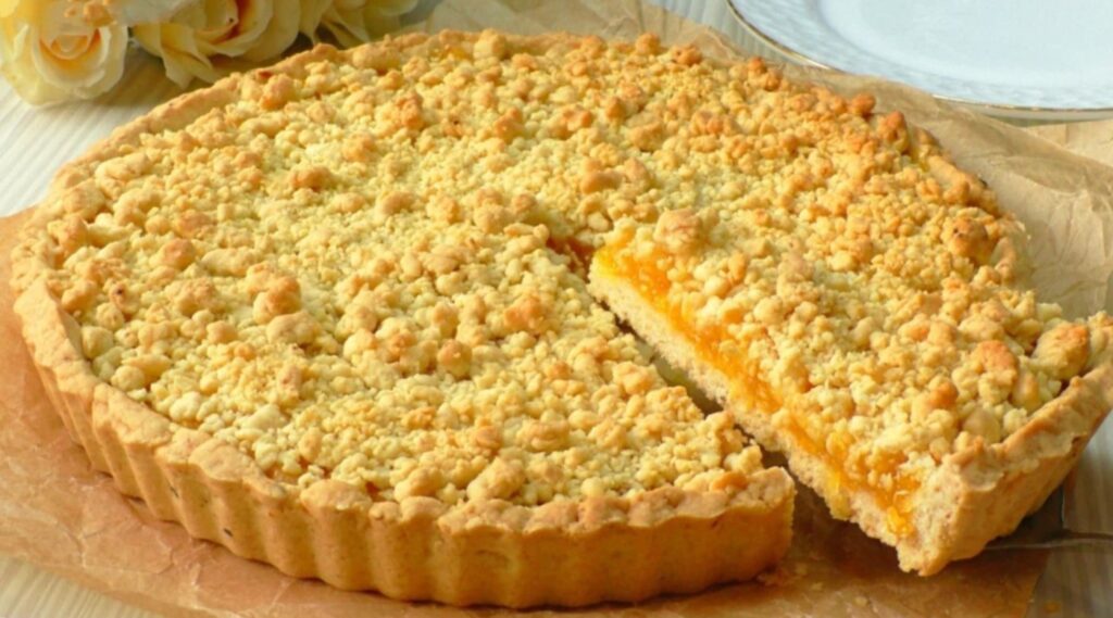 Įdarą uždėkite ant tešlos, lygaus lygio ir pabarstykite antrąją trupinių dalį.