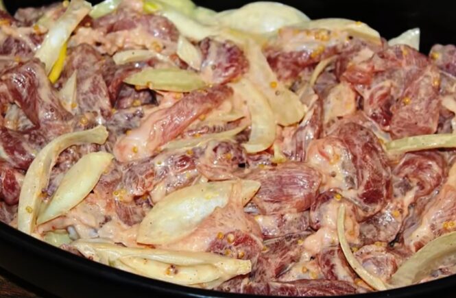 Kepimo forma yra sutepta augaliniu aliejumi, išdėlioti mėsą su svogūnais, laistyti padažu.