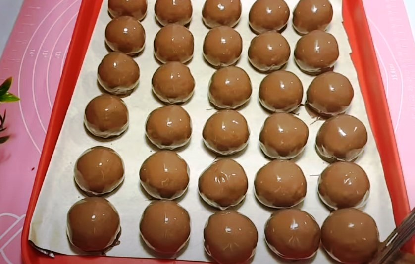 Mes įdedame saldainius į šokoladą, pašaliname, suplakame perteklių ir įdedame į pergamentą.