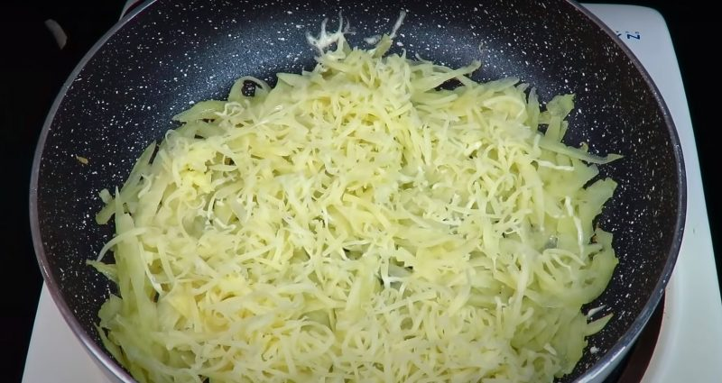 Ant keptuvės pridedame lašą augalinio aliejaus ir įkaitiname. Šiuo metu patrinkite bulves ant vidurinių tarkos dantų.