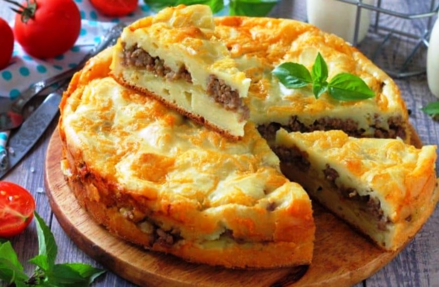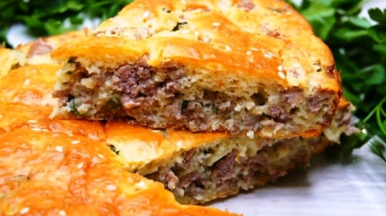 Paprastas labai skanaus pyrago receptas su mėsos ir žaliųjų svogūnų įdaru, šviežiais žalumynais.