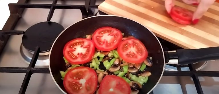 Mes supjaustome kiaušinius į 2 dalis ir dedame pomidorus, druską, pipirus ir pabarstome kitais prieskoniais.