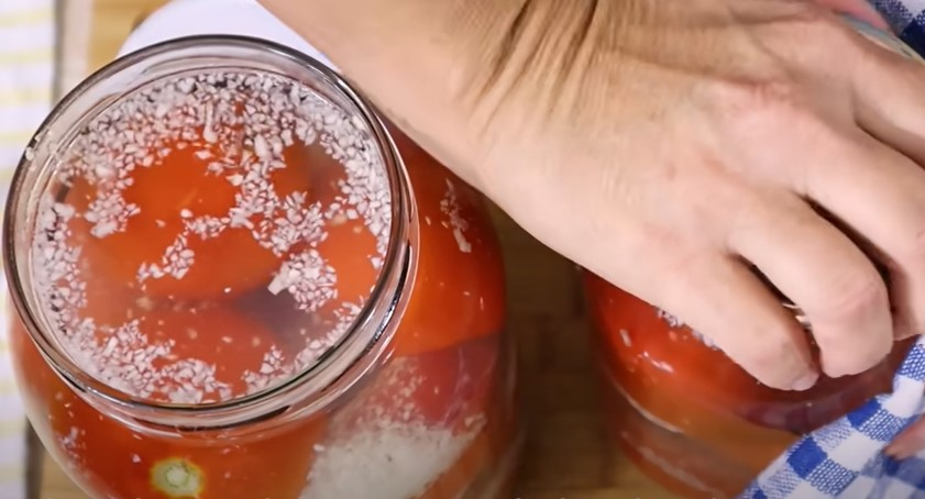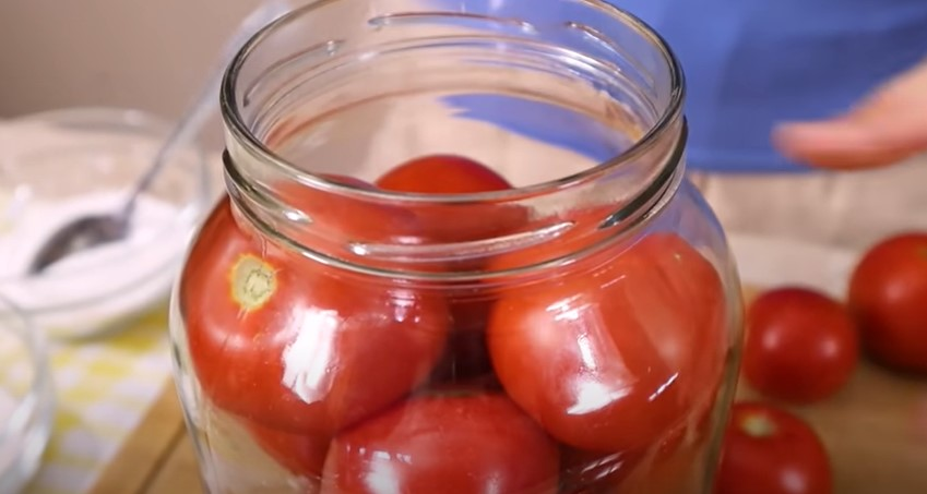 Pomidorus įdedame į švarias skardines ir pilame verdantį vandenį.