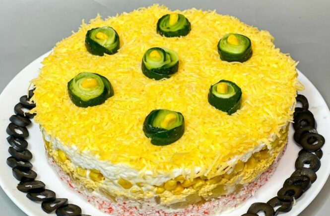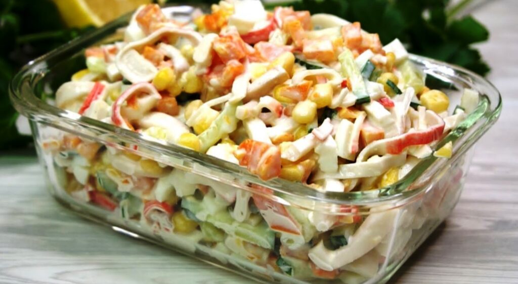 Visus produktus sumaišykite su kukurūzais ir užpildykite majonezu.