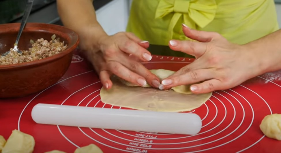 Mes bandome druską ir įpilame pipirų, galite česnakuoti. Tai yra antrasis įdaras.Tešla yra patenkinama ir padalinama į 3 dalis, o tada padalinkite viską į 30 kamuoliukų.
