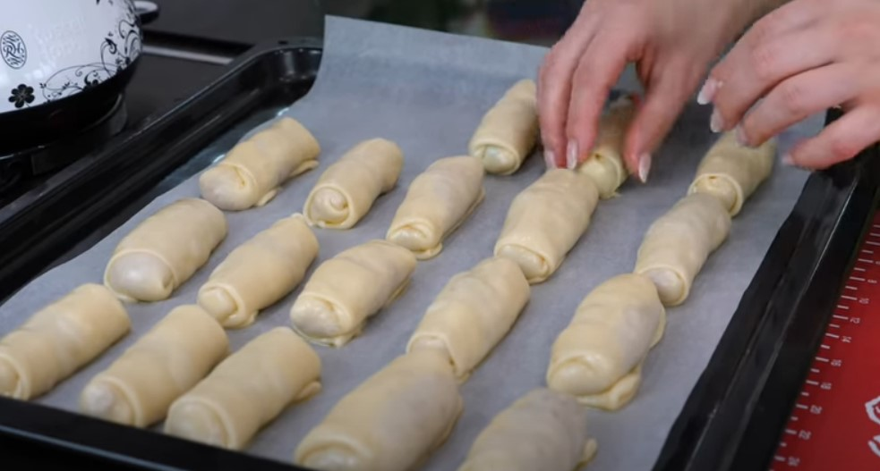 Įdėkite vamzdelius su užpildu ant kelnės, padengtos pergamentu.