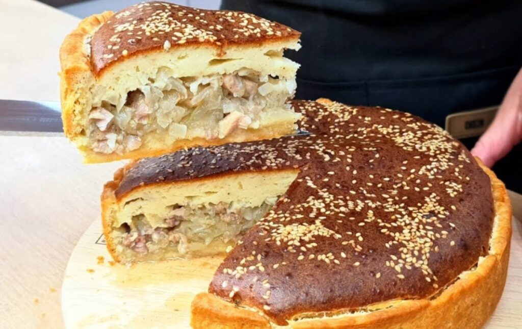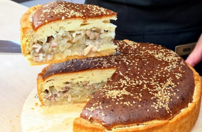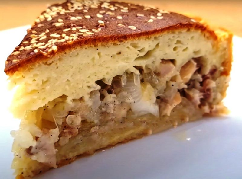 Prieš išimdami pyragą orkaitėje, viršų galima apibarstyti sezamu. Taigi mes turime skanų ir ne visai sunku paruošti pyragą iš vištienos.