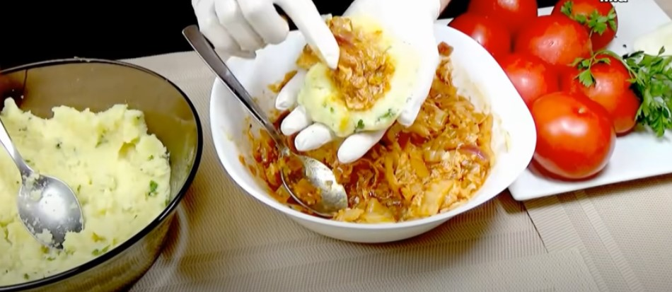 Suformuoti valtį iš bulvių košės ir gulėti kopūstai viduryje.
