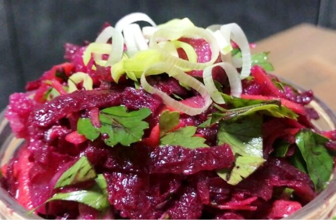 Trys ant didelių tributinių burokėlių ir morkų, sumaišyti.